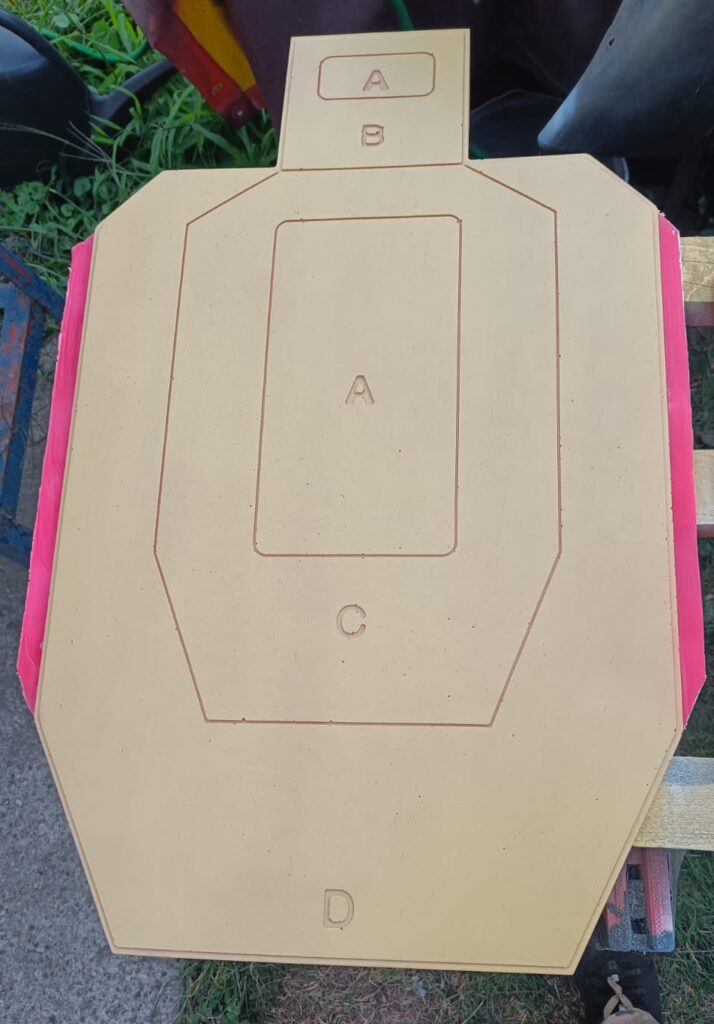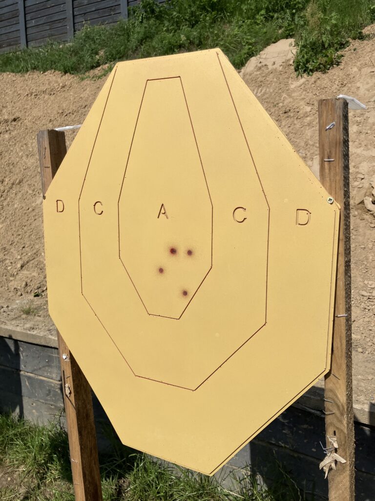 Good old IPSC ACD shield shape target. Shot marks appear in red. Zero spray is yellow.